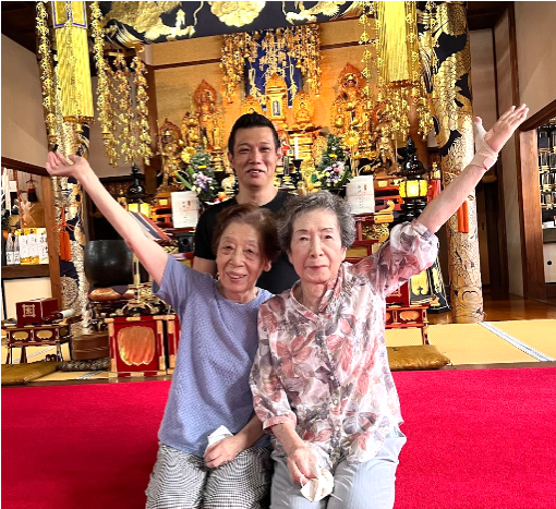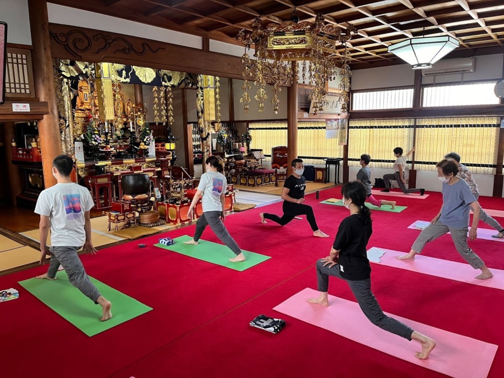 毎週⽉曜⽇朝10:00~(90分間)開催しているお寺でのストレッチ教室には、30代〜91歳のシニアまで⼝コミで集まった⽅々10名ほどが参加しています。参加者のみつ⼦さん(91)、敬さん(91)からは「つまずき転倒がなくなった。ストレッチ後は⾝体が楽で姿勢正しく歩けるようになった。よく眠れるようになった。」などと健康の秘訣として3年以上通い続けています。