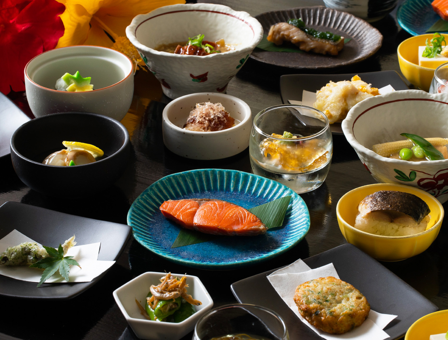 創業 1645 年、京都伏見にある「招徳酒造」から直送の酒粕を使⽤した粕汁も提供。京都の老舗「服部豆腐」の厚揚げを使用した「飛厚揚げの夏野菜餡掛け」は、白出汁でじっくりと炊き上げた厚揚げに夏野菜をふんだんに使用した餡を掛けた品。