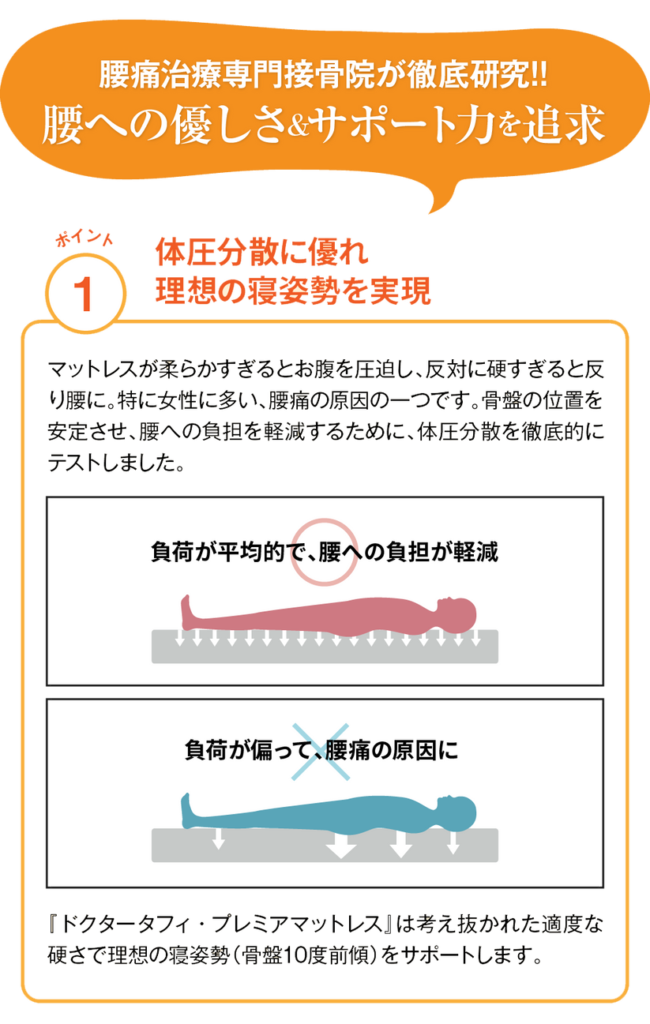 そこで、『ドクタータフィ』は表と裏で硬さの違う「極(きわみ)二層構造」を採用。身体がマットレスに沈みこみすぎず、理想的な寝姿勢を保ち、スムーズな寝返りをサポートしてくれるマットレスを開発した。