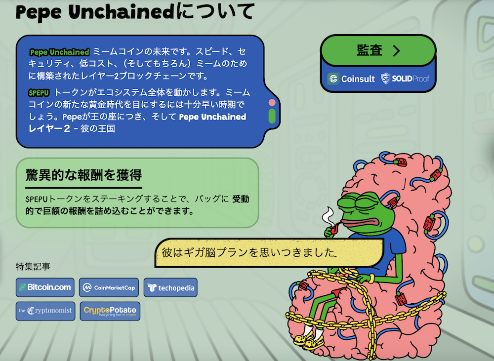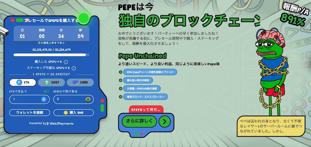 Pepe Unchained(ぺぺアンチェーンド)は、仮想通貨のミームコイン分野でトップ3を走るPepe(ぺぺ)の改良版として登場した新しいミームコイン。