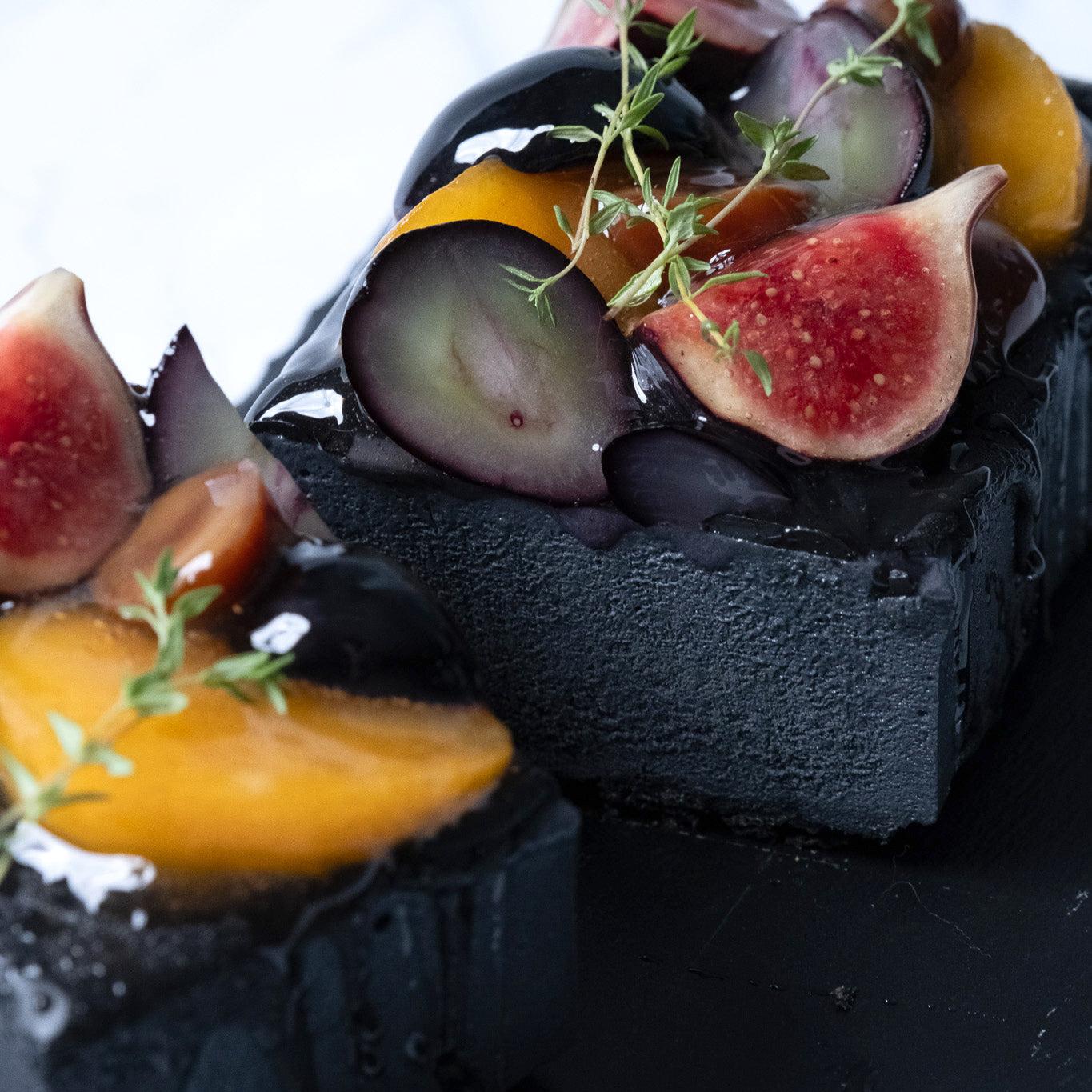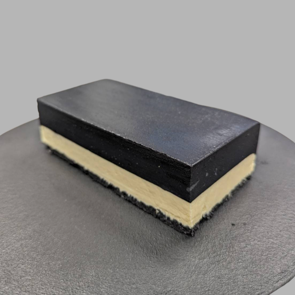 竹炭で色を付けた黒の層はチーズをしっかりと感じられる仕上がり。白い段はサワークリームも使いさっぱりとした何口食べても飽きの来ないような甘さと美味のある仕上がりになっている。