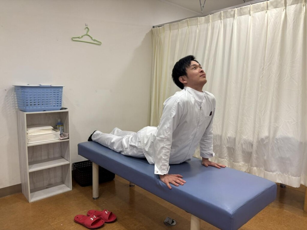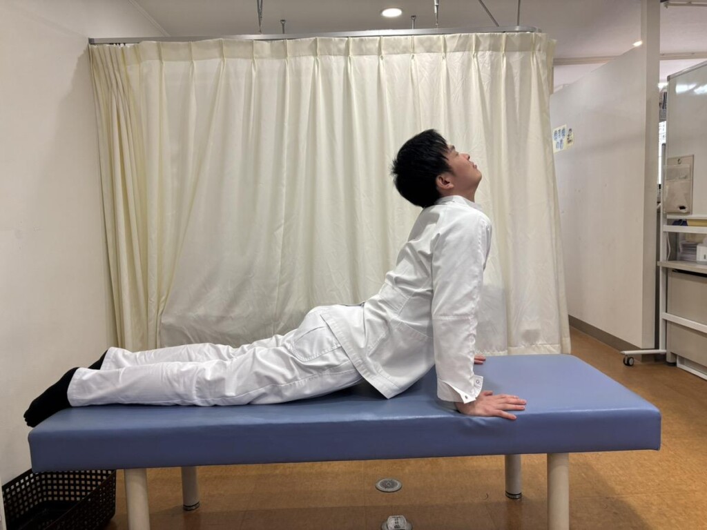 1. うつ伏せの状態になり、足は肩幅程度に開いておく。 2. 肩の真下に手を置き、手のひらで床を押しながら上半身を起こす。 3. 胸を張った状態で呼吸を繰り返し、お腹前面の伸びを感じながら30秒ほどキープする。 4. 息を吐きながら上半身を床方向に戻す。 5. 2~4を3セット繰り返す。 |