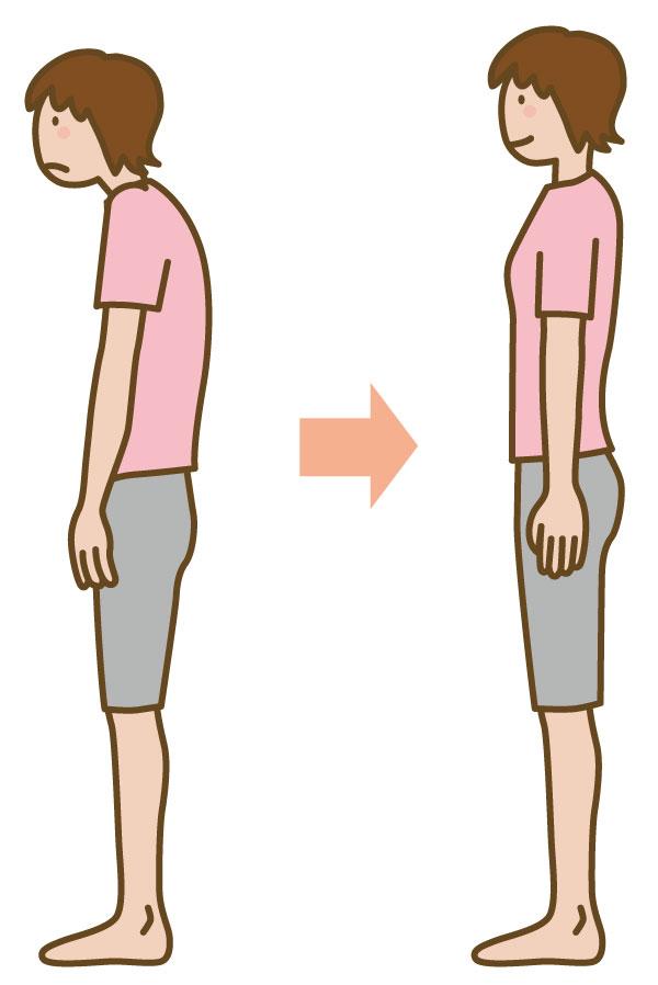 腸腰筋、中殿筋がうまく使えていないと骨盤が後方に倒れ、立った時に反り腰になってしまう。