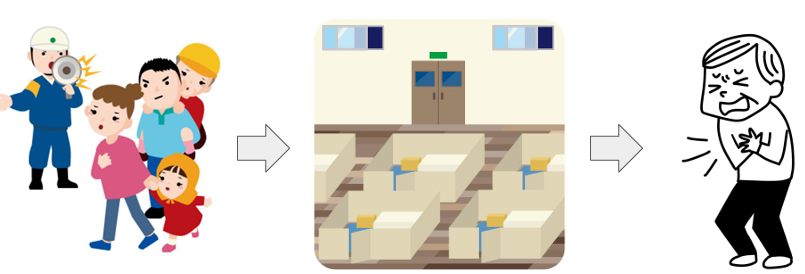 避難所生活を送ると、エコノミークラス症候群、感染症(インフルエンザ、コロナ、胃腸炎、肺炎など)、転倒などの危険が考えられる。
