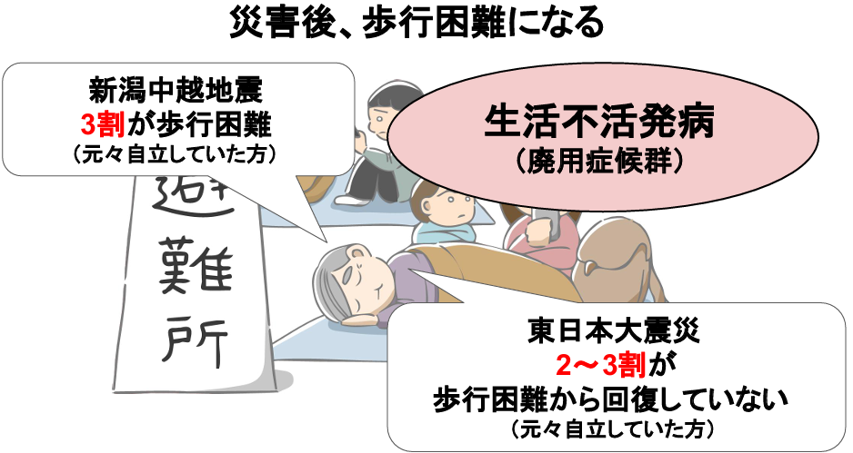 高齢者の方は若い人達と比べると、避難所生活などで活動性が低下してしまい、身体機能面や認知機能面の低下があらわれやすい。身体機能面や認知機能面の低下により、今まで出来ていたことが出来なくなってしまい、要介護状態になってしまう人もいる。