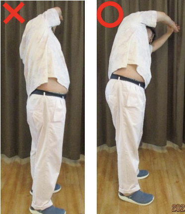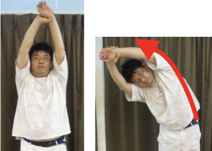 ① 背筋を伸ばし、伸ばしたいほうの腕を上げます 反対の腕で手首を持つ。 ② 上げた腕を上に引っ張る。そのまま、身体を斜め前へ45度倒する。反対側も同じように行う。 POINT:腕だけにならないように、身体ごと傾ける。 |