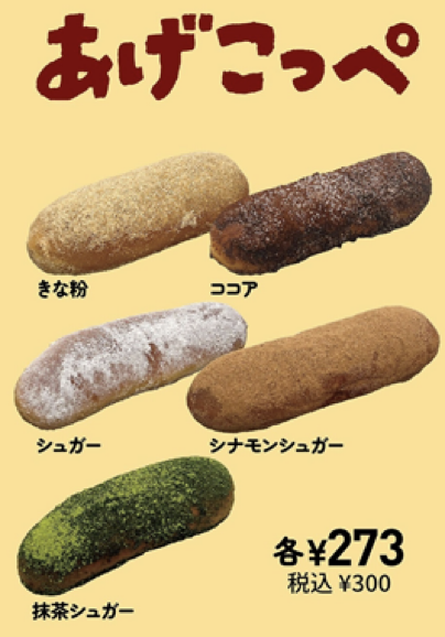 また、同店で1日300本売れるという大人気メニュー「あげこっぺ」は、きな粉・ココア・シュガー・シナモンシュガー・抹茶シュガーの全5種のフレーバーで提供!