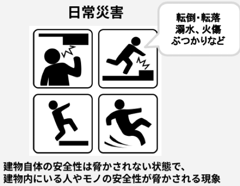 一方、日常災害は、建物⾃体の安全性は脅かされない状態で、建物内にいる⼈やモノの安全性が脅かされる現象をいう。