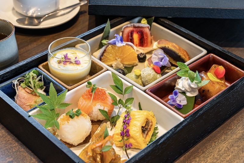 サーモンいくらと鯛の手毬寿司、鱚の南蛮の他、季節のフルーツ大福・抹茶の水羊羹など和スイーツを一度に楽しめるハイブリッドな松花堂弁当。