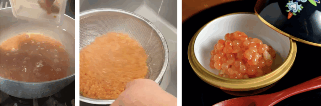 それは、半熟イクラを熱湯を沸かして、余熱で1分半温めるという方法。前大将が試行錯誤し、最高の味を提供できるのはこの時間と発見した。茹でた後は秘伝のタレに漬けて完成する。