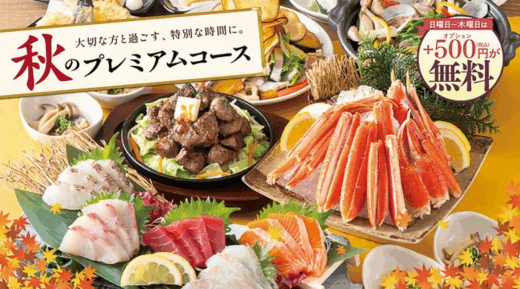 【秋のプレミアムコース】は、きのこや秋刀魚などの秋の味覚を盛り込んだ4,500円・5,500円・6,500円の3コース。全てのコースでビールを含む約40種類の人気ドリンク2時間飲み放題付き。