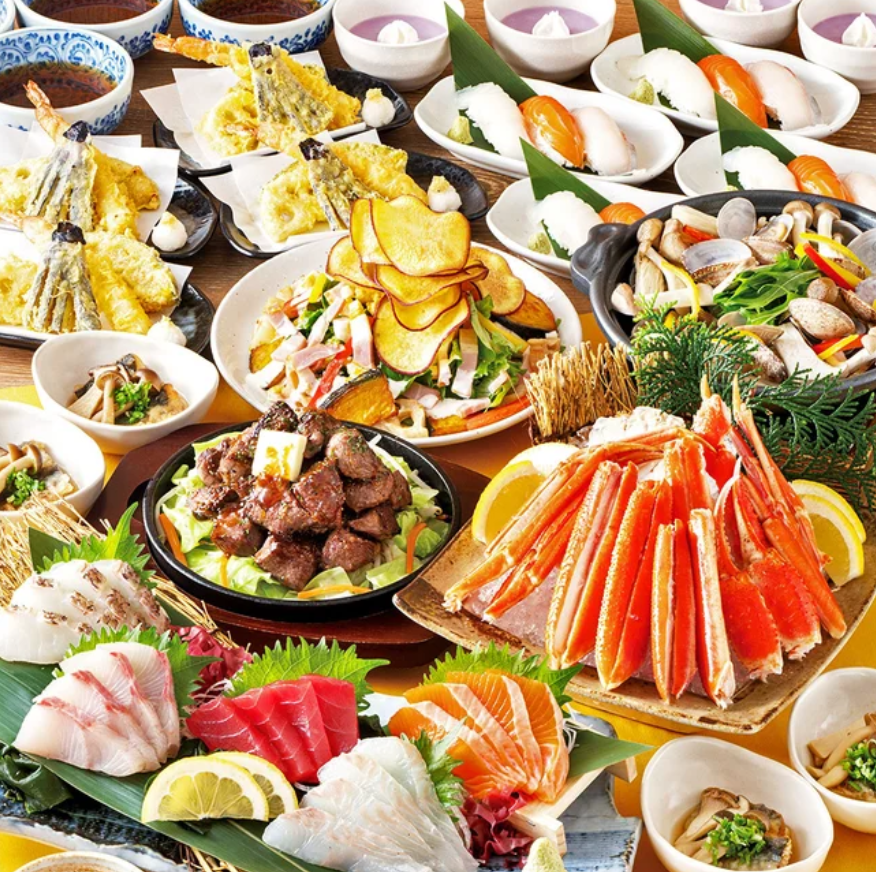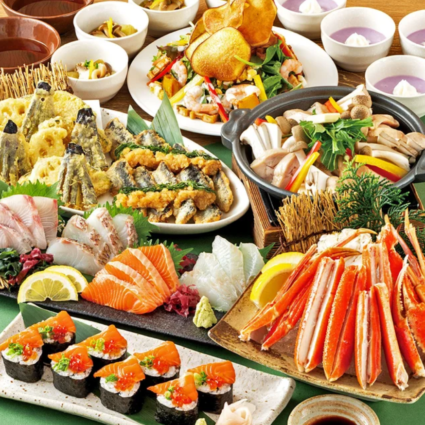 茹で本ズワイガニ、さんまの竜田揚げと秋野菜の天ぷら盛合せ、刺身四種盛合せなど人気メニューが満載のコースです 。