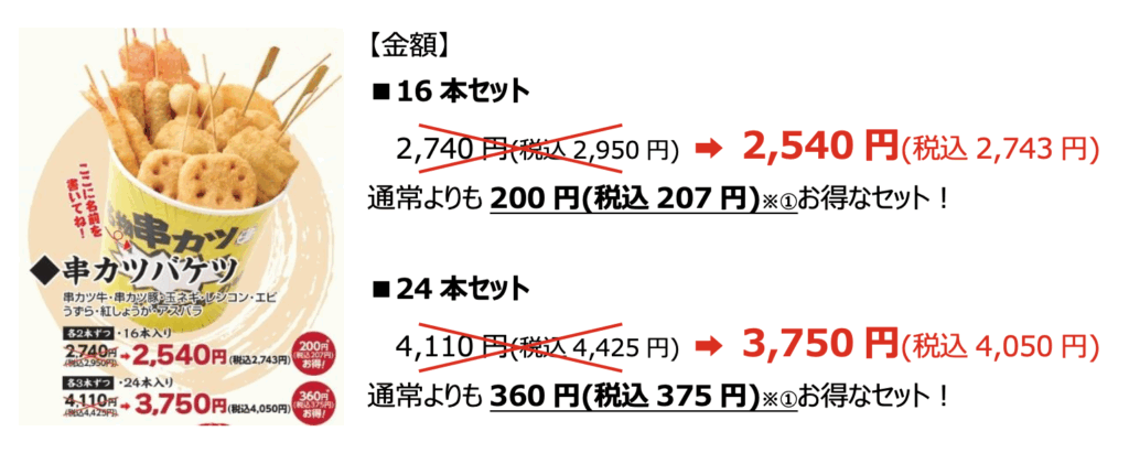 また、定番の串カツや季節限定の串カツのセットが単品で購入するよりもお得な金額設定になっています。