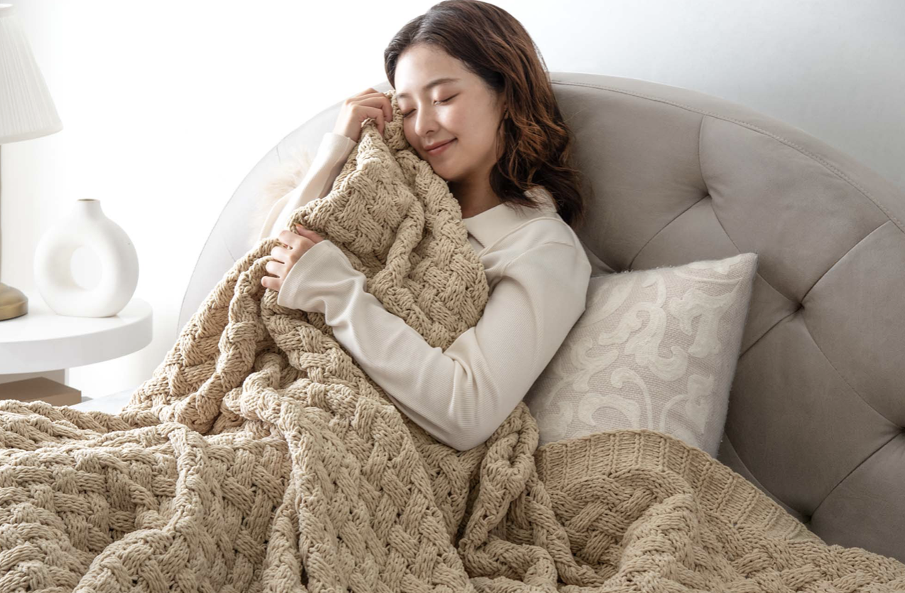 また、ベッドでの冷え対策にとどまらず、ひざ掛けや羽織、ソファにかけるインテリアアイテムとしても活躍し、季節やシーンを問わずご使用いただけます。