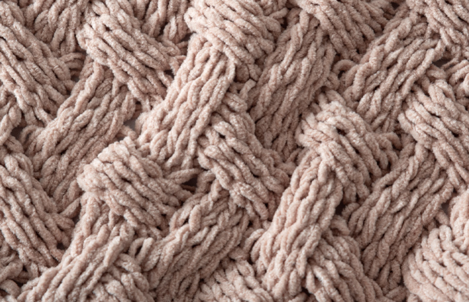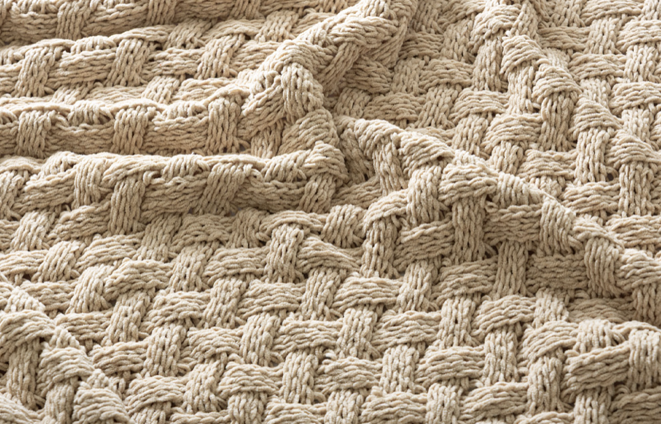本製品は編みかごのように縦横の糸が交差する立体的な“バスケット編み”を採用しています。在感のある編み目は、ナチュラルな可愛らしさを添えるだけでなく、SNS映えする今っぽいインテリアスタイルにもマッチします。