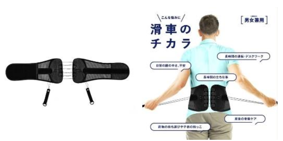 ベルトを腰や骨盤周りに巻き付けて、紐を左右に引っ張るとギューッと締め付ける腰、骨盤サポーターです。プレート固定方式では難しかった、腹・腰・骨盤の周囲全方位からギューッと締め込めます。腰は締め込む事で、腹圧が高まって腰骨が安定します。骨盤が緩むと脊柱などの連携している骨が不安定になります。ギュッと締め込む事で元の位置に戻します。