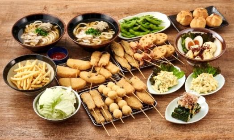 ■串カツ(7 種) 串カツ牛、串カツ豚、レンコン、玉ネギ、ハムカツ、アジフライ、タコウィンナー、うずら ■サイドメニュー キャベツ、枝豆、梅きゅうり、ポテトサラダ、 マカロニサラダカレー風味、かすうどん、ポテトフライ、ミニデザート ■デザート ミニデザート |