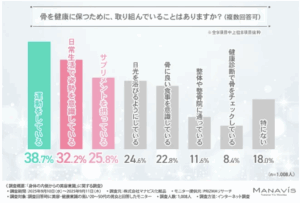「骨を健康に保つために、取り組んでいること」について尋ねたところ、『運動をしている(38.7%)』と回答した方が最も多く、『日常生活で姿勢を意識している(32.2%)』『サプリメントを摂っている(25.8%)』となりました。 「骨の健康維持に取り組んでいる理由として当てはまるもの」について尋ねたところ、『年をとっても元気で歩き続けるため(61.4%)』と回答した方が最も多く、『美容やスタイル維持のため(49.5%)』『身体を動かしやすくするため(48.6%)』となりました。 |