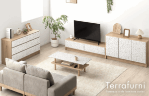 「テラファニ(Terrafurni)」は、タンスのゲンが展開している“Terrazzo furniture(テラゾーファーニチャー)”を略したシリーズ名称です。イタリア発祥の建材である「テラゾー(terrazzo)」の美しい意匠性を家具に落とし込み、日常空間に馴染むデザインに仕上がっています。建築やインテリアで再注目されるテラゾー柄を、木目調と組み合わせてナチュラルモダンな雰囲気に演出します。