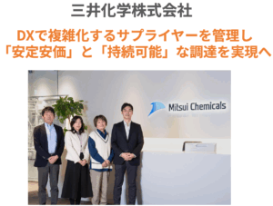 三井化学株式会社は、グローバルに事業を展開する総合化学メーカーとして、「安定安価」かつ 「持続可能」な調達体制の構築を目指している。 属人的でアナログなサプライヤー管理から脱却し、DXを活用した効率化を推進。Resilire(レジリア)を導入し、Tier2以降のサプライチェーン情報 を可視化したことで、有事の際の安否確認や影響 把握を自動化迅速化した。これにより、調達リスクへの対応力を高めるとともに、⻑期的なサプライチェーン強化を実現している。