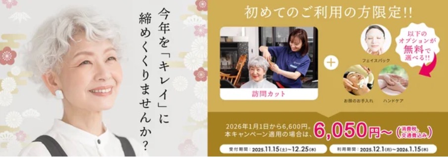 訪問カットに加えて、お顔のお手入れ・フェイスパック・ハンドケアの中から1つ、お好きなオプションを無料でお選びいただけます 。「新しい年を、気持ちよく迎えてほしい」そんな想いを込めた特別なキャンペーンをご用意いたしました。