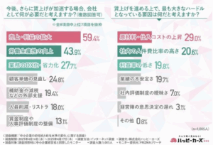今後、賃上げが続く場合に必要なことについては、売上・利益の拡大、労働生産性の向上、業務のDX化など、経営基盤の強化が不可欠という共通認識があることがわかりました。また、賃上げを進める上での課題については、人件費を含むコストの増加が最大の懸念であるようですが、その他にも利益が低いことなど多面的な課題が浮き彫りとなりました。