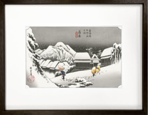 歌川広重の名作版画集「東海道五拾三次」の一つで、シリーズの中でも突出した傑作といわれています。濃淡の墨のぼかしで雪の質感や量感を見事に表現した普遍的な名作風景画。そこに登場するドラえもんたちの表情が愛らしいドラえもん浮世絵です