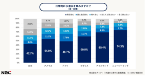 海外では水道水を日常的に飲む割合が高く、ニュージーランドで 74.3%、イギリスで 60%、アイルランドで 69.4%となりました。一方、日本は 42.7%と6カ国で最も低く、「全く飲まない」層も他国に比べて割合が多いことがわかりました。
