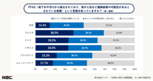 アメリカ、ドイツ、イギリスでは3人に1人以上がPFASを「知っていて内容も理解している」と回答しました。一方、日本ではPFASを「聞いたことがない」と回答した人が 51.3% と過半数に達し、6カ国で最も高い結果となりました。