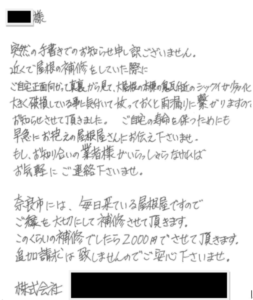 「訪問営業後の業者の“動き”をよく見たほうが良いです」と森氏。 近所の屋根を見ながらウロウロし、訪問していたら、悪徳業者の可能性があるという。 「最近、増えている手口が、直筆の手紙の投函なんです」と森氏。 →写真のような手書きの手紙が投函されていても無視すべきだという。 |