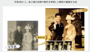 当社ではAI技術を活用し、1枚の写真から故人様の表情や動きを再現した短い動画を生成し、複数の映像を組み合わせて2~3分程度のメモリアルムービーとして提供しています。