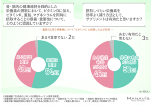 「骨・筋肉の健康維持を目的とした栄養素の摂取において、ビタミンDに加え、ビタミンK、亜鉛、マグネシウムを同時に摂取することの意義・重要性について、どのように認識しているか」と尋ねたところ、9割以上が『非常に重要(54.6%)』『ある程度重要(43.3%)』と回答しました。