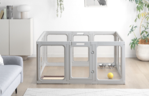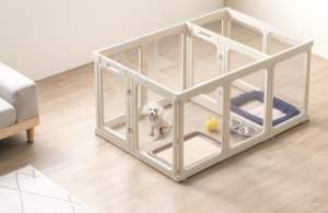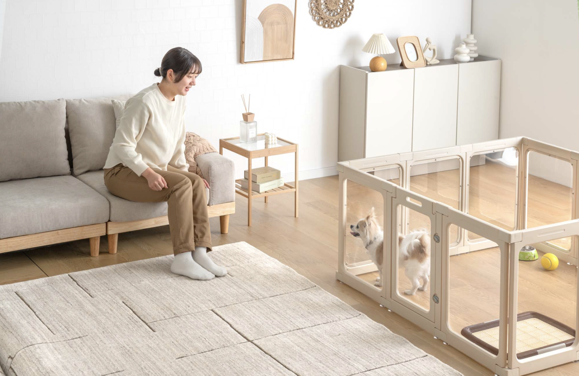 前述の通り、本製品はクリアパネルで仕上げているので離れたところからでも安心して見守ることができます。また、クリア設計にすることでわんちゃんも飼い主さんが見えて安心したり、囲われ感がなくストレスを感じにくかったりというメリットがあります。またスチール製の一般的なサークルだと柵に引っかかってケガをしたりと心配な点もありますが、本製品はそのような心配なくご使用いただけます。