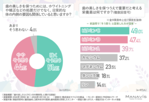 「歯の美しさを保つためには、ホワイトニングや矯正などの処置だけでなく、日常的な体の内側の要因も関係していると思うか」と尋ねたところ、9割以上が『強くそう思う(51.9%)』『ややそ思う(44.1%)』と回答しました。