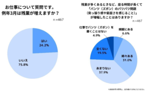 ●お仕事について質問です。例年 3 月は残業が増えますか?という設問には、約 4 人に 1 人の 24.2%の方が「はい」と答えました。